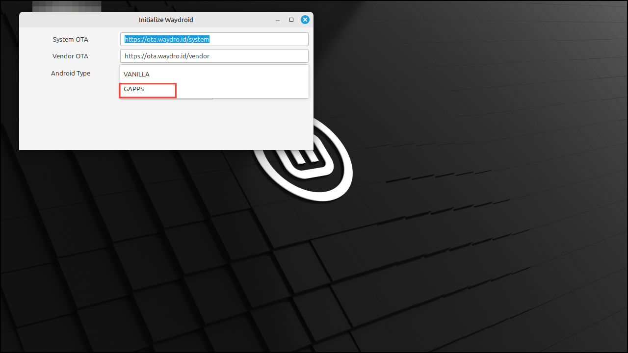 - When WayDroid launches, click on the 'Android Type' dropdown menu and select 'GAPPS'. If you choose 'Vanilla', you will not be able to access Google Play Services and will therefore be unable to install apps using the Play Store.