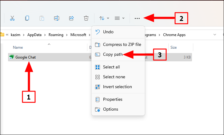 - Right-click the executable file, click the ellipsis (⋯), and choose Copy path.