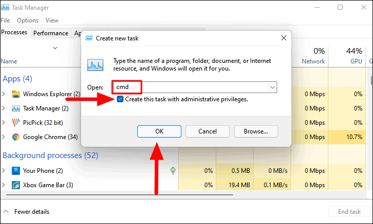 cmdfor Command Prompt). - Hold down Ctrl + Shift and click OK or press Ctrl + Shift + Enter.
