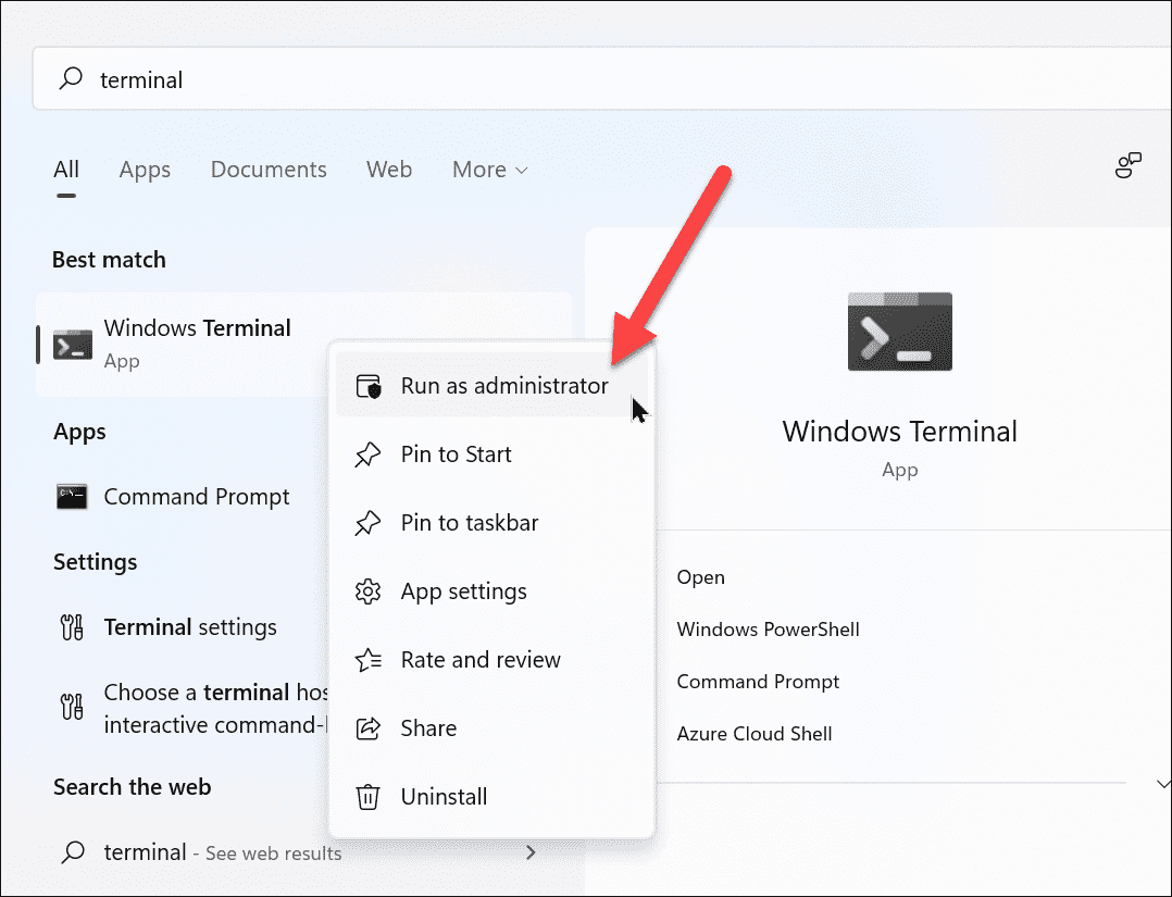 - Open Windows Terminal as an administrator. Search for 'Terminal' in the Start menu, right-click on 'Windows Terminal', and choose 'Run as administrator'.