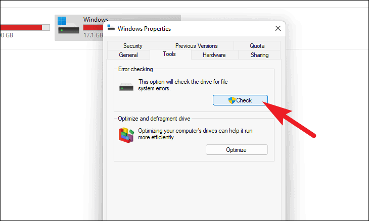 - In the 'Properties' window, switch to the 'Tools' tab and click the 'Check' button in the 'Error checking' section.