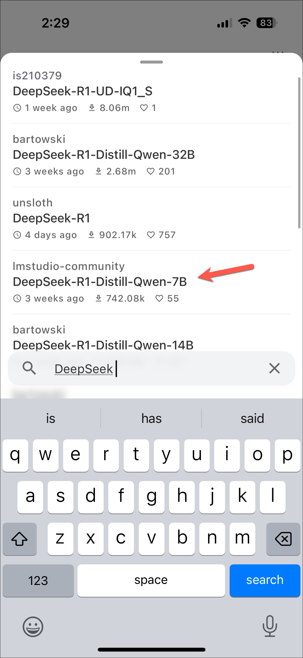 - Type 'DeepSeek R1' in the search bar to find the model you want to install and tap on it.