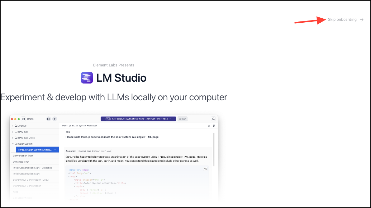 - Open LM Studio once it is installed and click on 'Skip onboarding'.