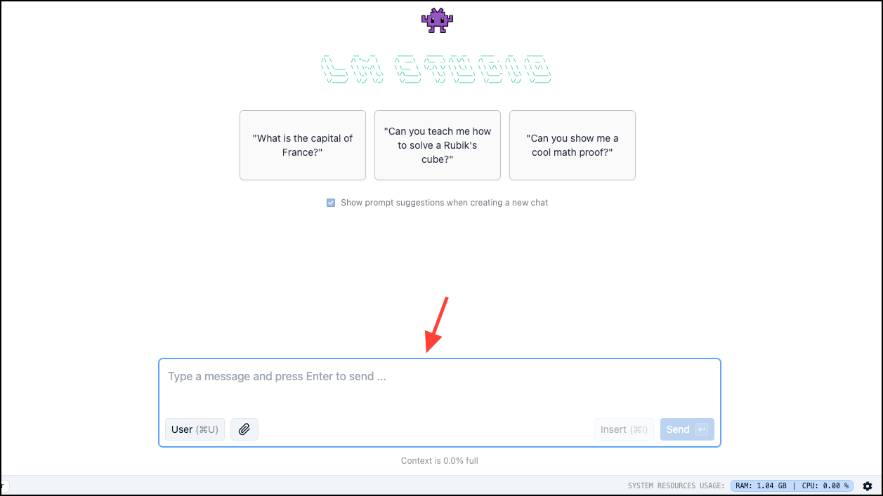- Simply enter your message in the window and chat with the model locally. You'll be able to monitor the resource usage by the model from the bottom-right corner of the status bar.