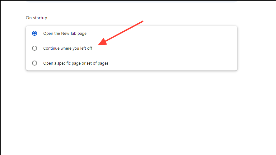 Step 4: Choose the 'Continue where you left off' option. Chrome will now reopen your previous tabs every time you launch it.