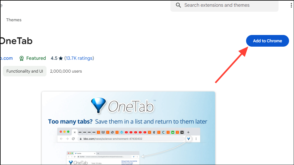 Step 1: Go to the OneTab extension page in the Chrome Web Store and click 'Add to Chrome' to install it.