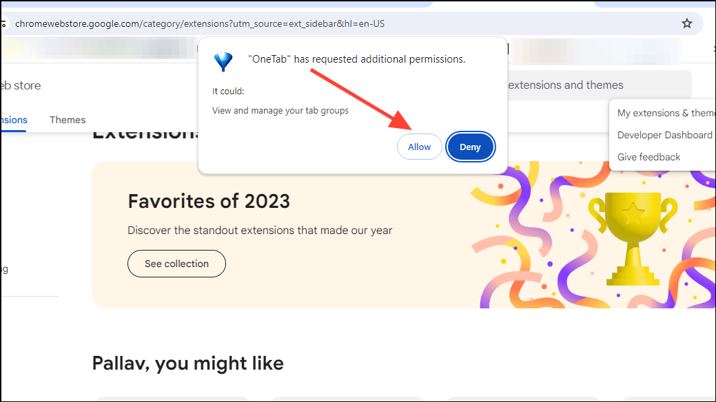 Step 4: When prompted, click 'Allow' to grant OneTab permission to manage your tab groups.