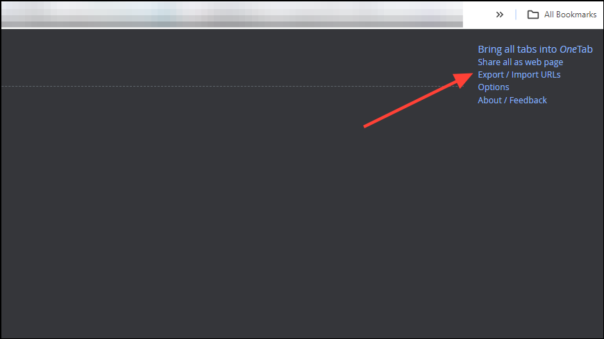 Step 6: To export your tabs, click on 'Export/Import URLs' on the right side of the OneTab page.