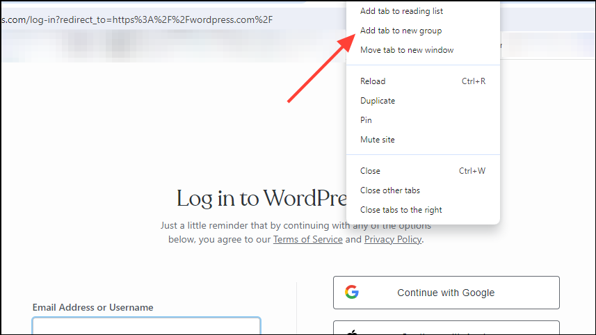 Step 2: Select the 'Add tab to new group' option from the menu to create a new group.