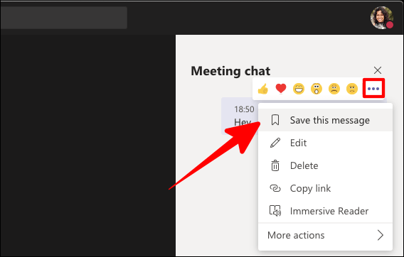 This would open the ‘Meeting Chat’ panel, where you would find the conversations of the ongoing call. Hover the cursor over any message you’d like to save and click on the ellipses icon that appears above the text. Now select the ‘Save this message’ option.