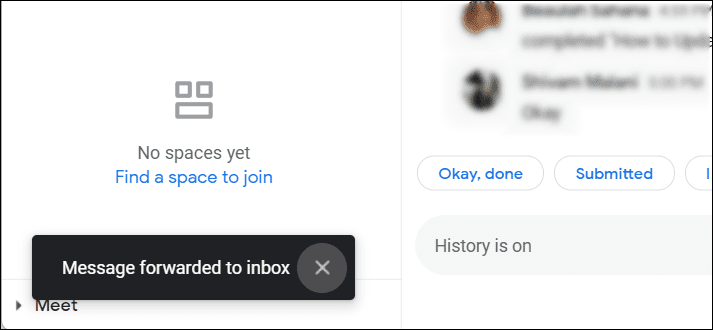 You will receive a brief ‘Forwarding’ notification at the bottom right corner of the Google Chat window. This notification will soon shift to ‘Message forwarded to inbox’.