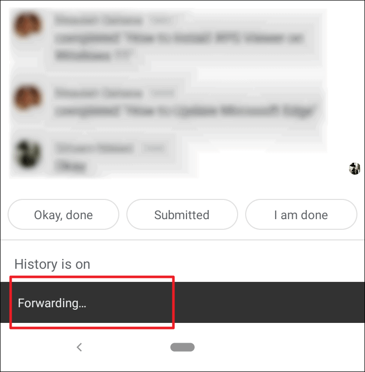 You will instantly receive a ‘Forwarding’ notification at the bottom of the chat window. It will change to ‘Message forwarded to inbox’ in seconds.