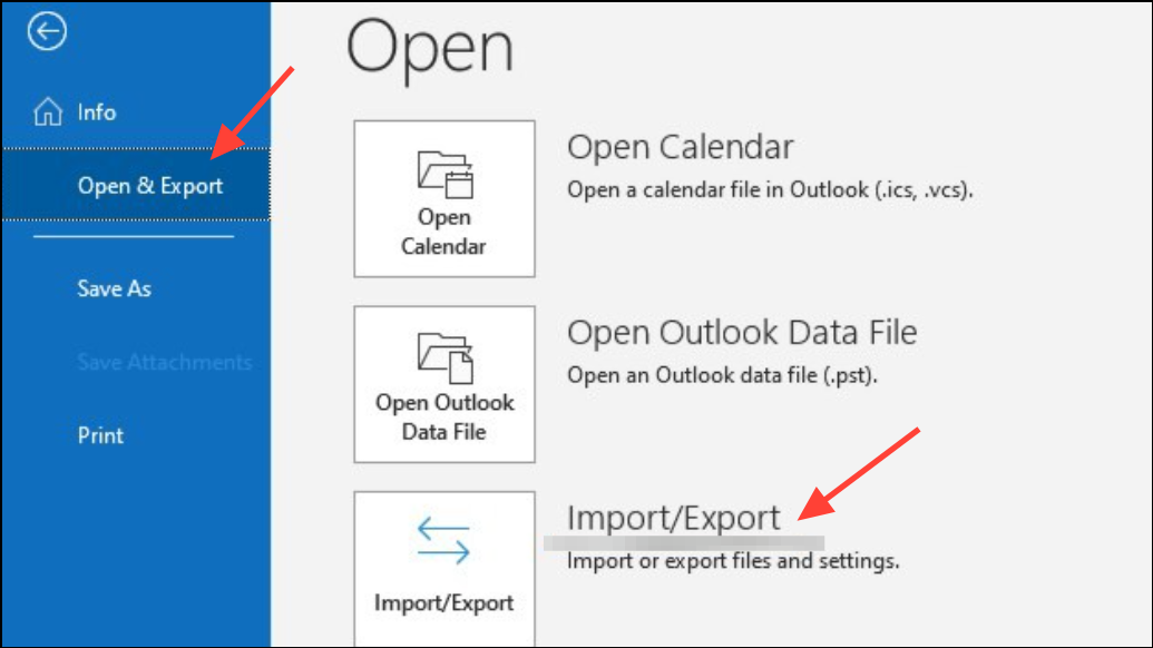 Step 2: Select Open & Export from the sidebar, then click Import/Export.