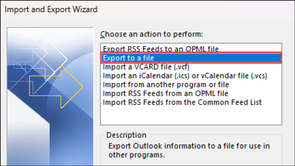 Step 3: In the Import and Export Wizard, choose Export to a file and click Next.