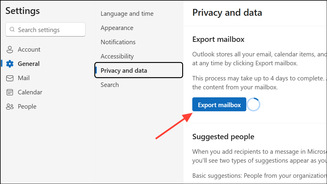 Step 2: Go to General > Privacy and Data, then look for the Export mailbox option. If available, request the export and wait for the download link to be sent to your email.