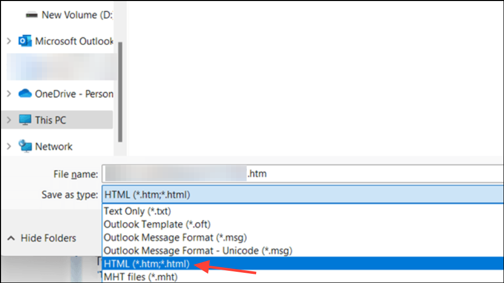 Step 2: In the Save as type dropdown, choose Text Only or HTML and select a location on your PC.