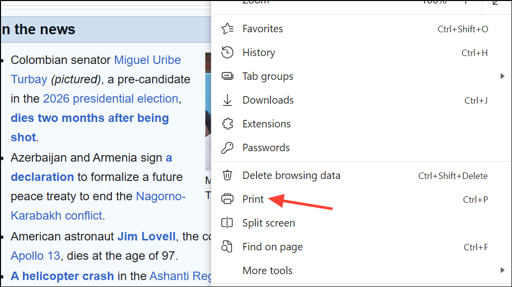 Step 2: Access the browser menu by clicking the three dots in the upper right corner, then choose Print. Alternatively, you can press Ctrl + P (Windows) or Cmd + P (Mac) for a shortcut.