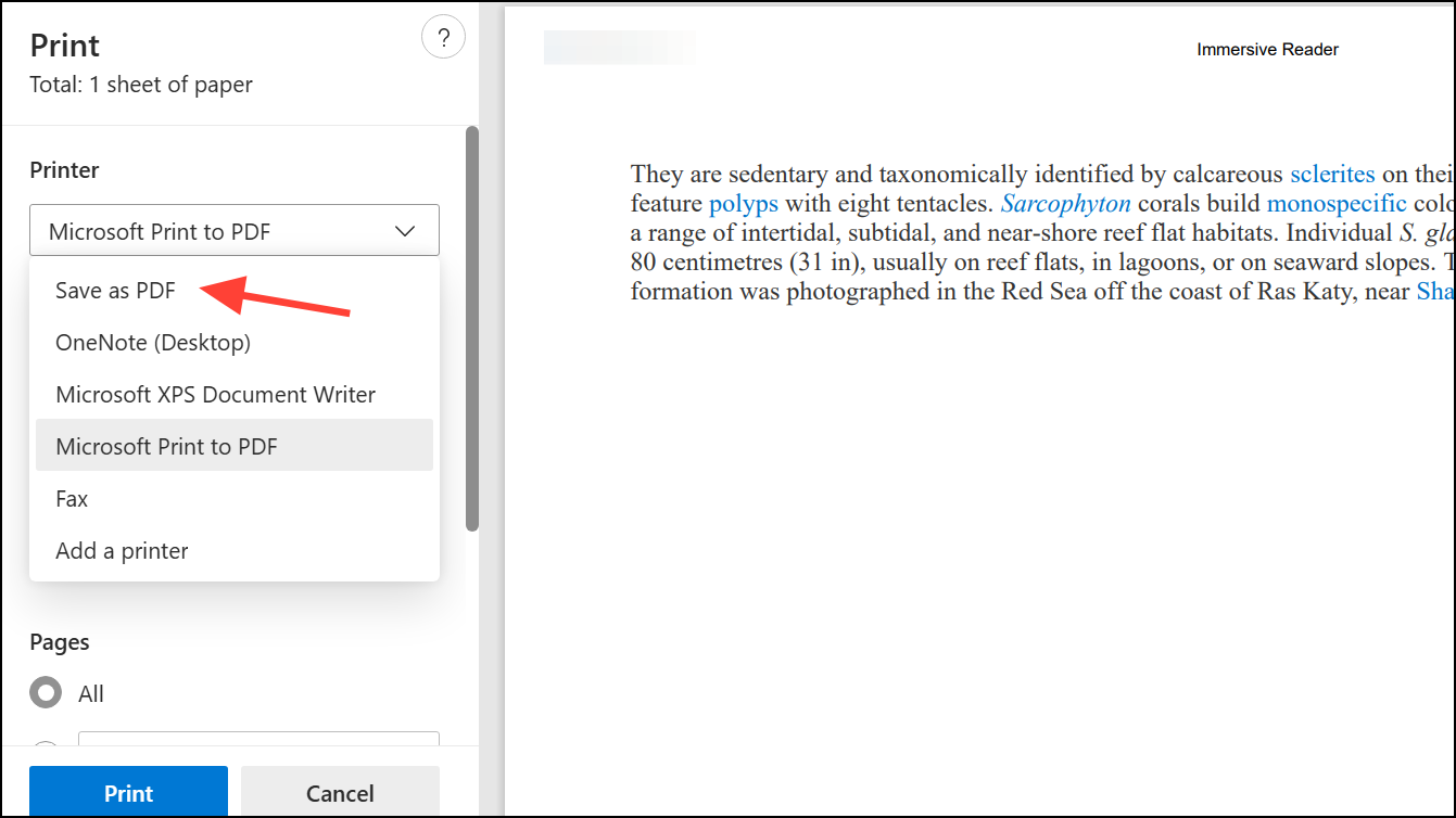 Edge’s built-in print-to-PDF function saves the full page, but sometimes you only need a portion of the content. While Edge does not natively support saving only selected content as PDF, you can work around this limitation using the Immersive Reader or browser extensions.