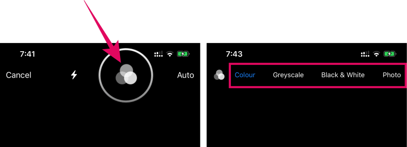 The scanner uses Colour mode as the default filter. To change it, tap the filter icon in the top row, and select a different filter.