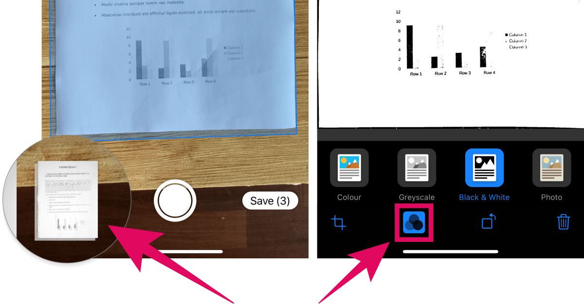 The document scanner in Files app can scan and save a document with Colour, Greyscale, Black & White filters.