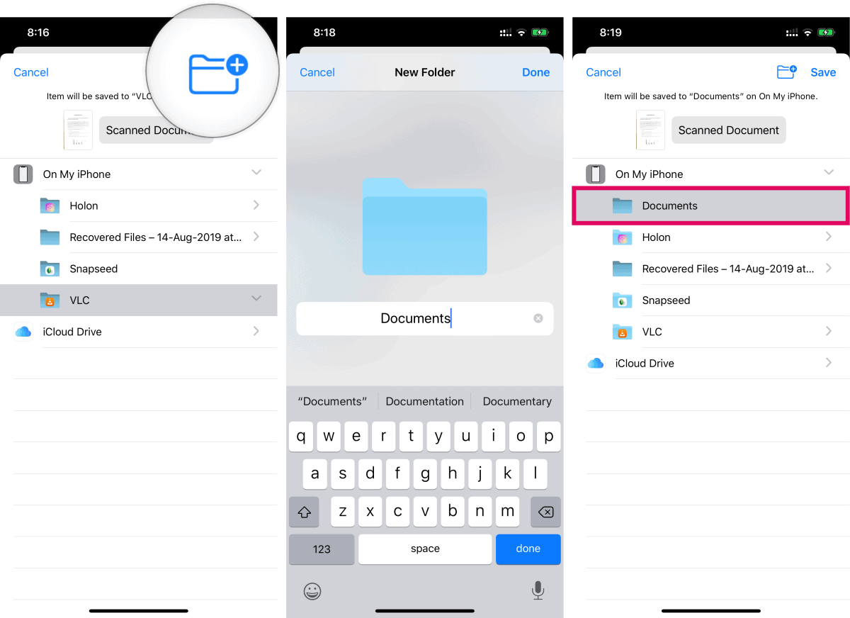 Select a folder where you want to save the documents, or tap the “Create New” folder icon at the top right side of screen to create a new folder to save the scanned documents.
