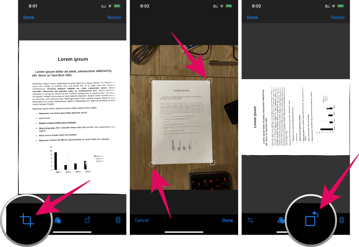 You can crop and rotate a document after taking its picture in the Files app. Tap on the preview in the bottom left side of a scanned document, and use the “Crop” and “Rotate” buttons at the bottom bar to adjust the scan to your liking.