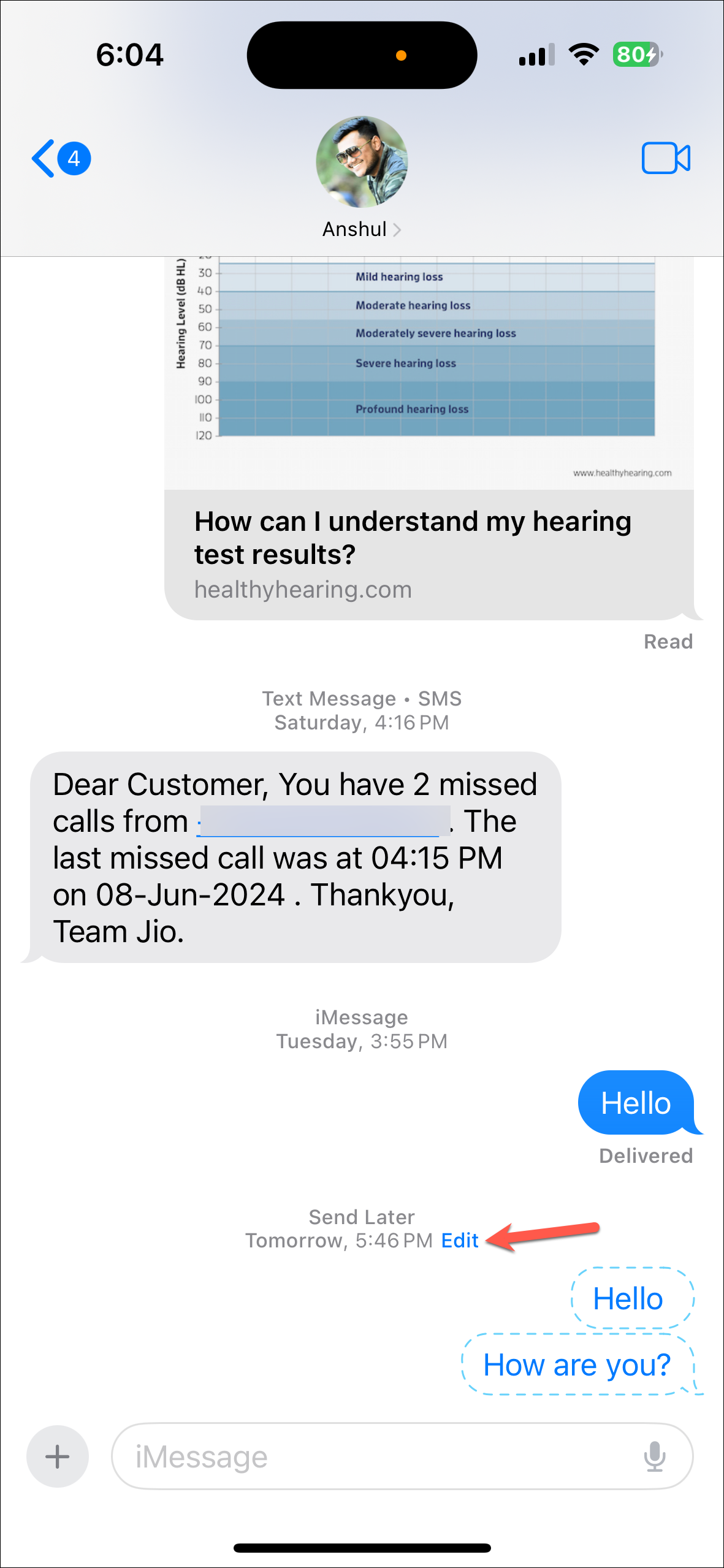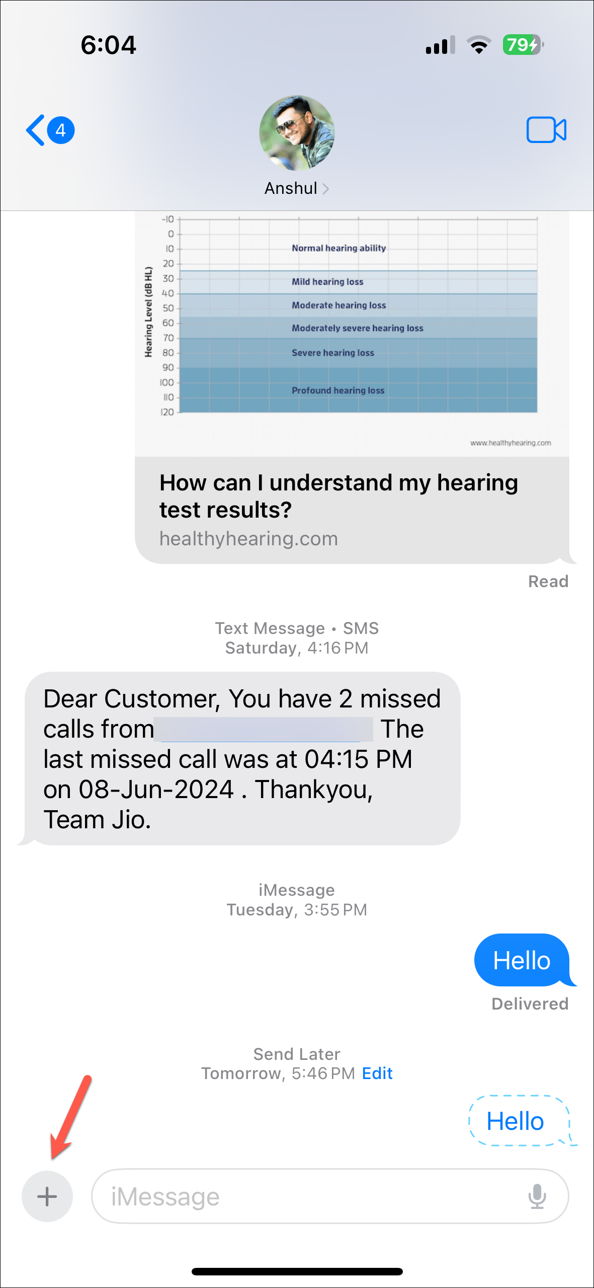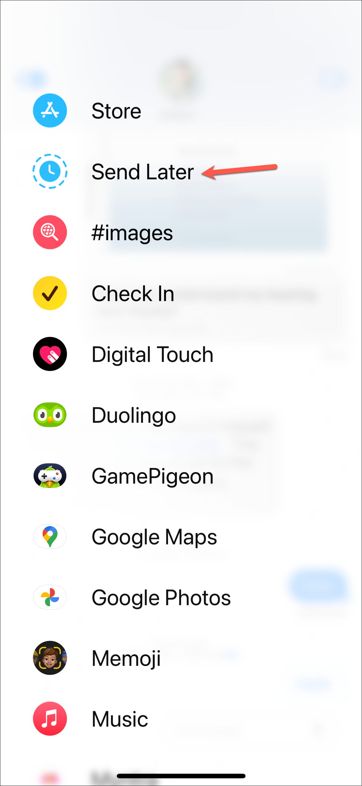 - Then, navigate to the chat where you want to schedule the message. It can be an iMessage chat with a person or a group chat. You cannot schedule messages in SMS chats, though.