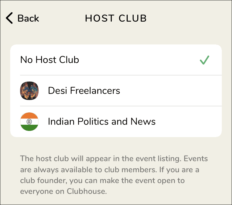 Next, you can add a ‘Host Club’ for your room to attract maximum people. Just tap on the option, and select a Club from the list. When you add a ‘Host Club’, the club members receive a notification which is a great way of promoting your room.