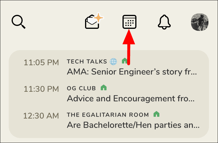 To schedule a room on Clubhouse, tap on the ‘Calendar’ icon at the top of the screen. This will open the upcoming events page.