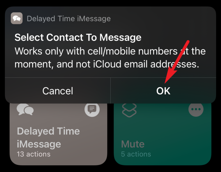 The shortcut will start running. You can only schedule messages to phone numbers with this shortcut at this point and not email addresses. Tap ‘OK’ to proceed. Your contacts will open. Select the contact you want to send the message to.