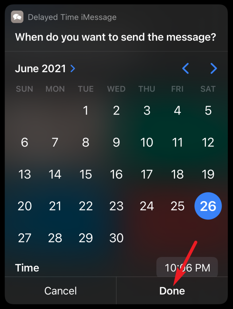 Next, choose the date and time you want to schedule the text for and tap ‘Done’.