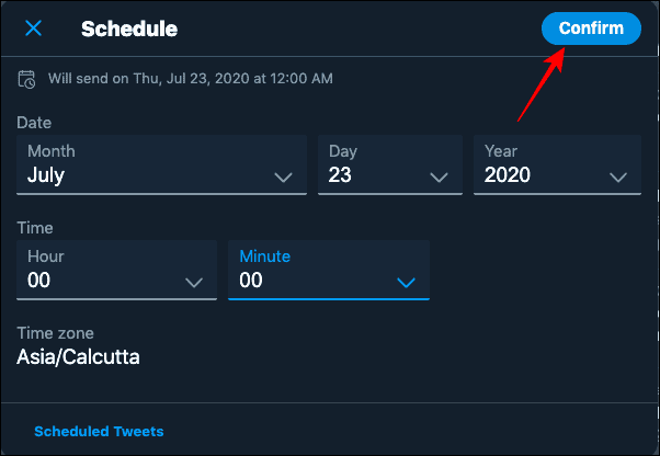 In the ‘Schedule’ interface that opens, customise the date and time you want the tweet to go live and click on the ‘Confirm’ button at the top right corner of the scheduling interface.