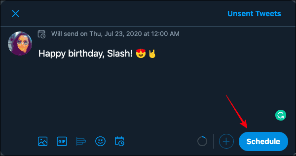 After you set a date and time, the ‘Tweet’ button on the box will be replaced by a ‘Schedule’ button. Click on it and your tweet will be scheduled and automatically publish at the date and time you configured for it to go live.