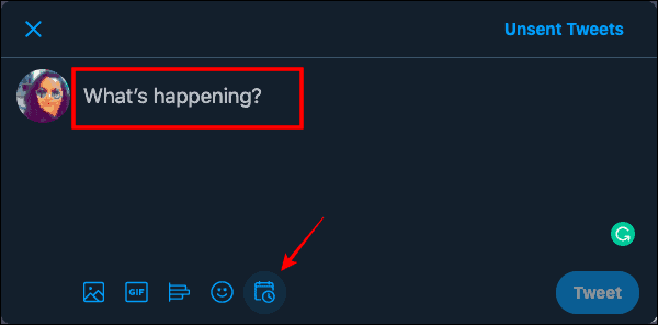 Type in your tweet in the text area like you usually do. Then, click on the ‘Schedule’ button (a calendar and clock icon) at the bottom of the tweet box.