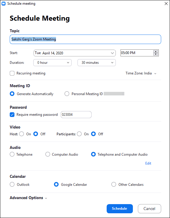 The scheduler window will open where you have to select all your meeting settings.