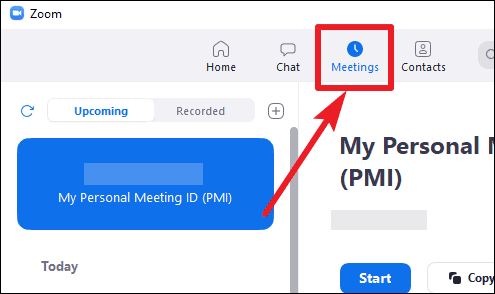 In the Zoom desktop client, click on the ‘Meetings’ tab from the top of the screen.