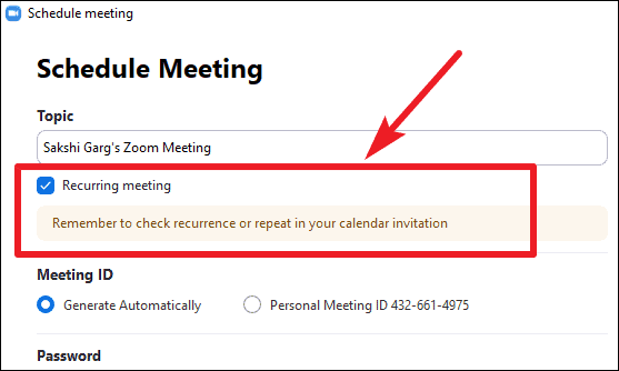 Note: For recurring meetings, you cannot use your ‘Personal Meeting ID’ as it is reserved so that you can start or schedule a meeting at any time.