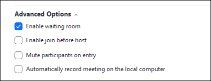 Click on ‘Advanced options’ to expand more options where you can choose to enable a waiting room, or join before host, mute participants on entry, or automatically record meeting on the local computer. Select the checkbox for the setting you want to apply.
