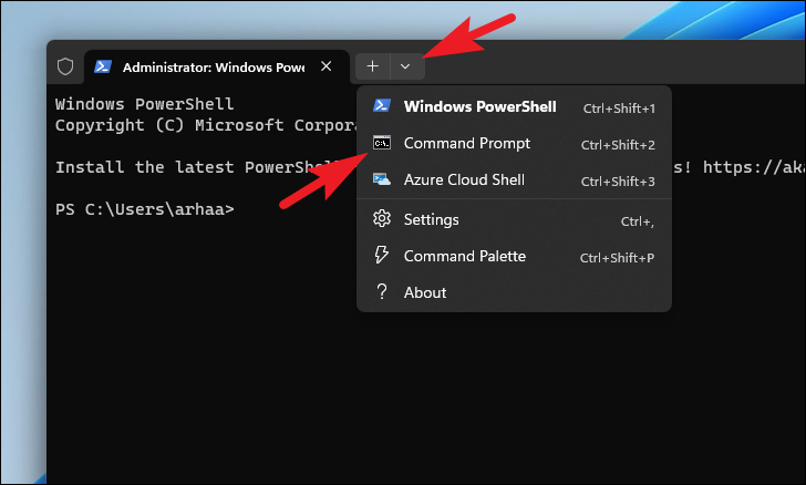 Step 3: In the Terminal window, click the downward arrow icon and select Command Prompt to open it in a new tab.