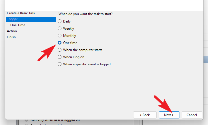 Step 4: Choose the frequency for the task. Select One time for a single occurrence or pick another option for recurring shutdowns. Click Next to proceed.
