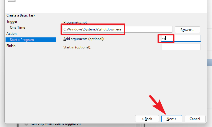 Step 7: In the 'Program/script' field, enter C:\Windows\System32\shutdown.exe. In the 'Add arguments' field, type -s (which specifies shutdown). Click Next to continue.