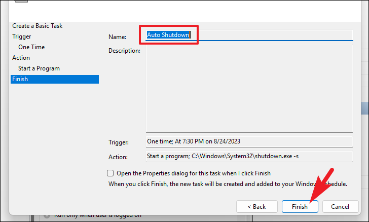 Step 8: Review your settings on the summary page. If everything looks correct, click Finish to create the scheduled shutdown task.