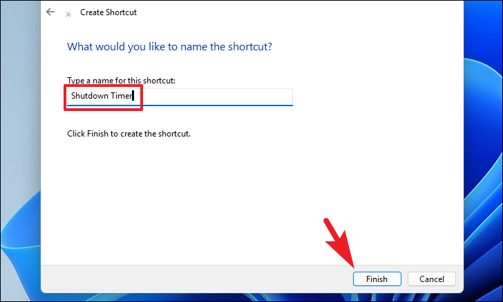 Step 3: Click Next, provide a name for the shortcut (e.g., "Scheduled Shutdown"), and click Finish.