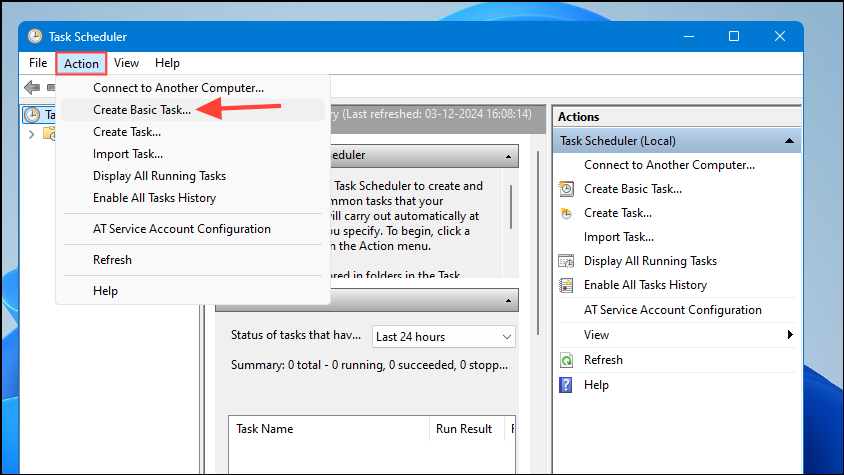 - When the Task Scheduler launches, click on the 'Action' menu in the menu bar at the top and select 'Create basic task'.