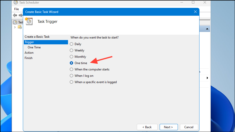 - Now you need to choose how frequently your PC will perform that task. If you only want it shut down automatically once, click on 'One Time' in the list of options. You can select another option depending on your preferences.