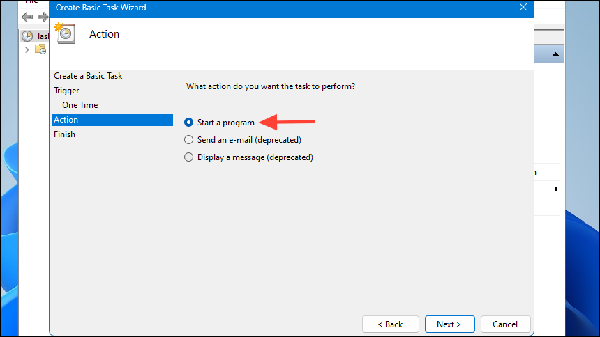 - Then select what you want the utility to do by clicking on the 'Start a program' option.