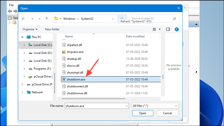 - Select the 'shutdown.exe' file in the folder by clicking on it.