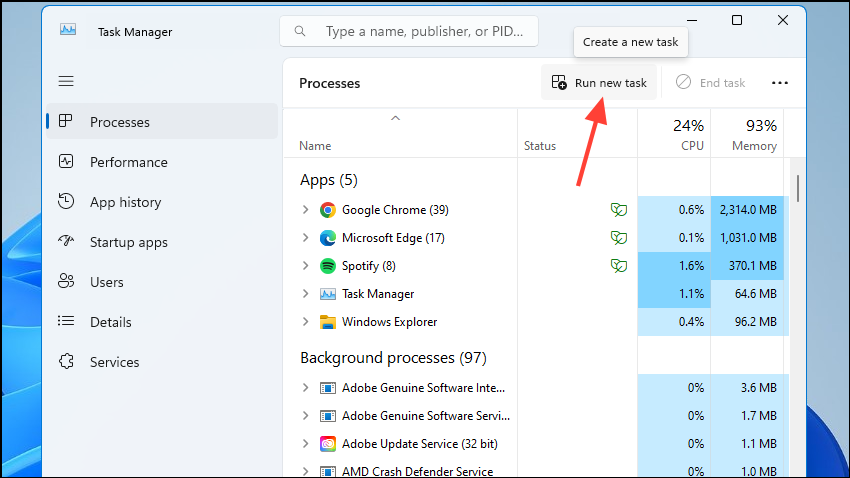 - When the Task Manager opens, click on 'Run new task' at the top.