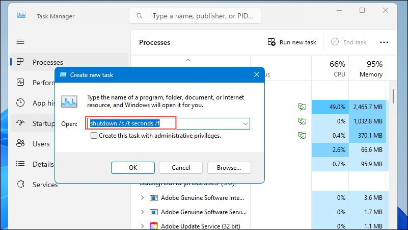 - Type the following in the text field, replacing seconds with the time until shutdown, like