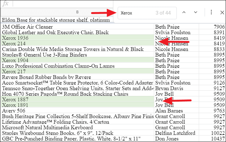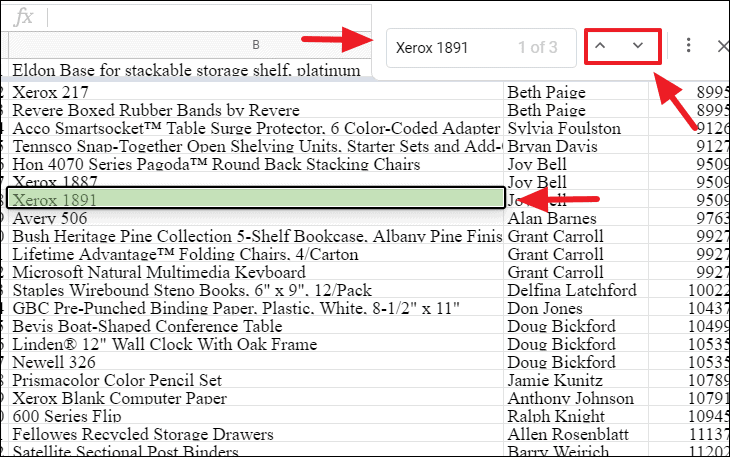 Step 5: Use the up and down arrows next to the search box to navigate through each highlighted cell sequentially.